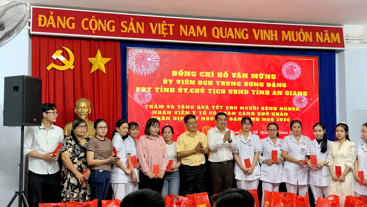 Chiều 8/2, đoàn công tác UBND Tỉnh An Giang do đồng chí Hồ Văn Mừng, Ủy viên Ban Chấp hành Trung ương Đảng, Phó Bí thư Tỉnh ủy, Chủ tịch UBND tỉnh An Giang dẫn đầu đoàn công tác đến thăm, tặng quà người bệnh nghèo, nhân viên y tế có hoàn cảnh khó khăn tại TTYT Khu vực Vạn Ninh nhân dịp Tết Bính Ngọ 2026.